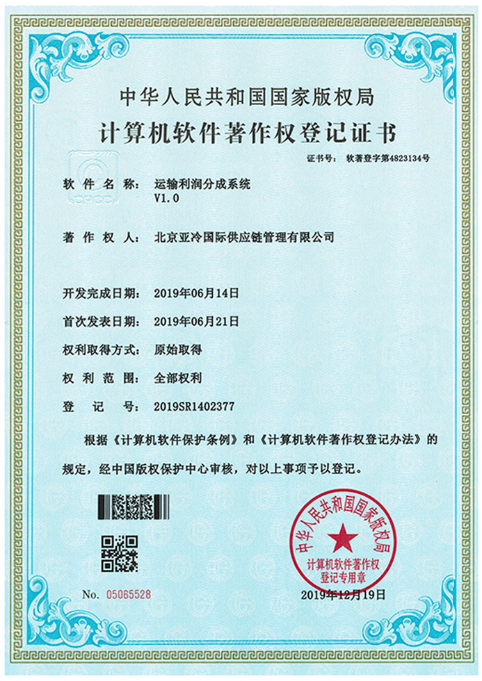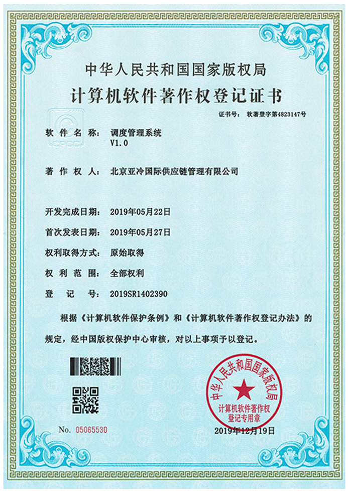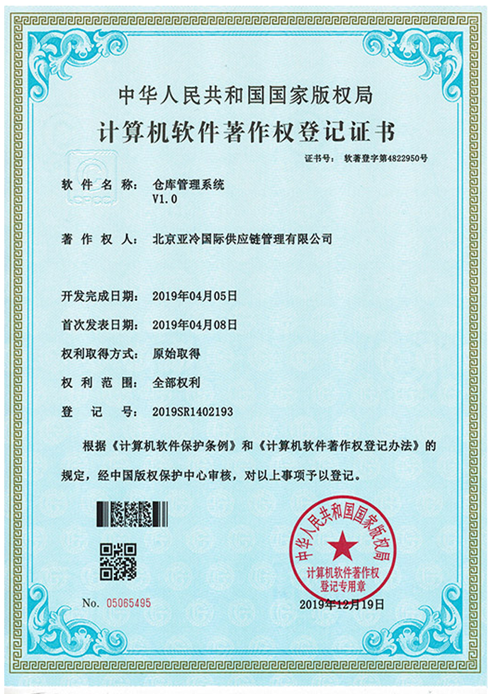 冷鏈客戶管理體系統軟件著作權登記證書