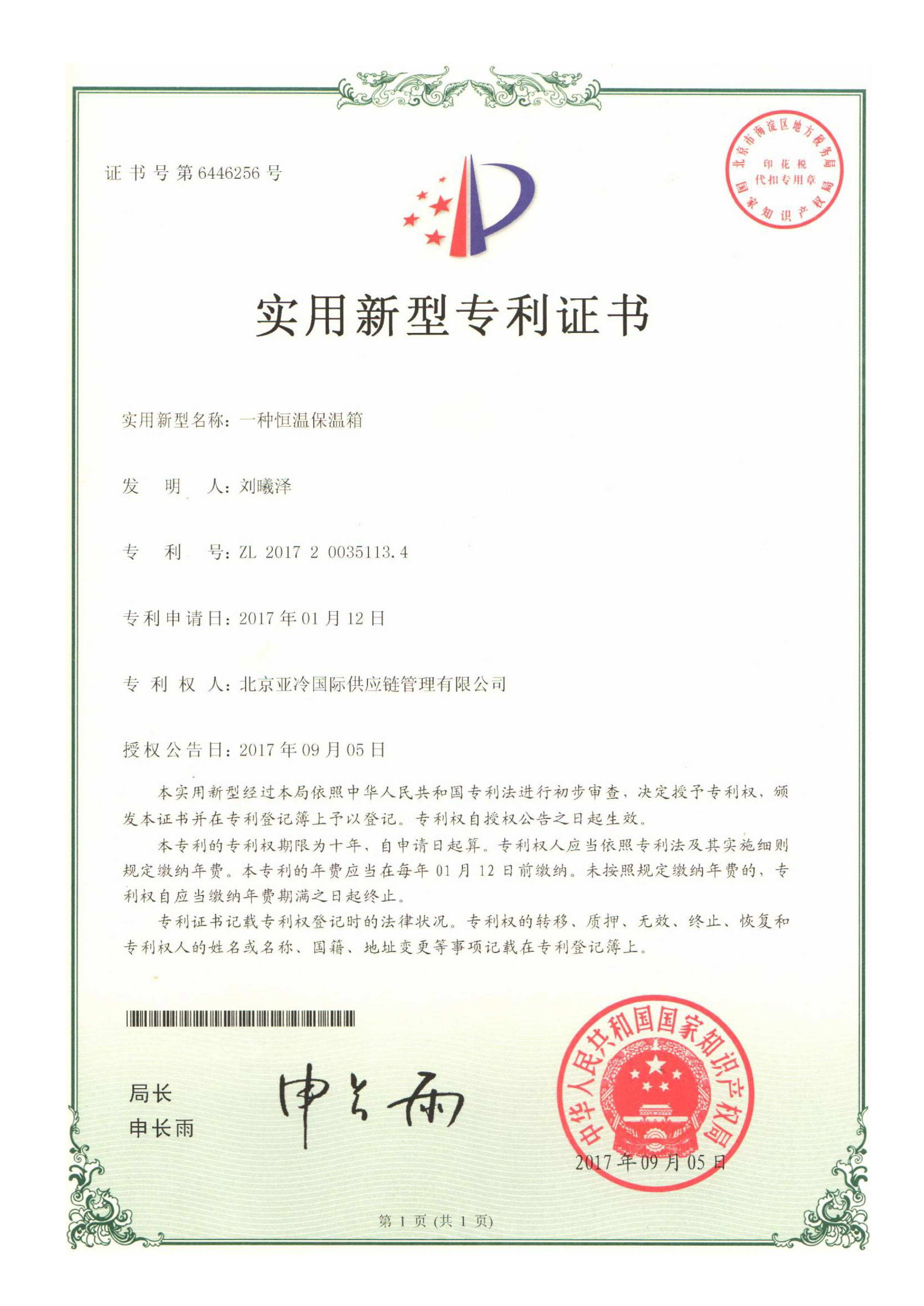 實用新型專利證書 恒溫保溫箱