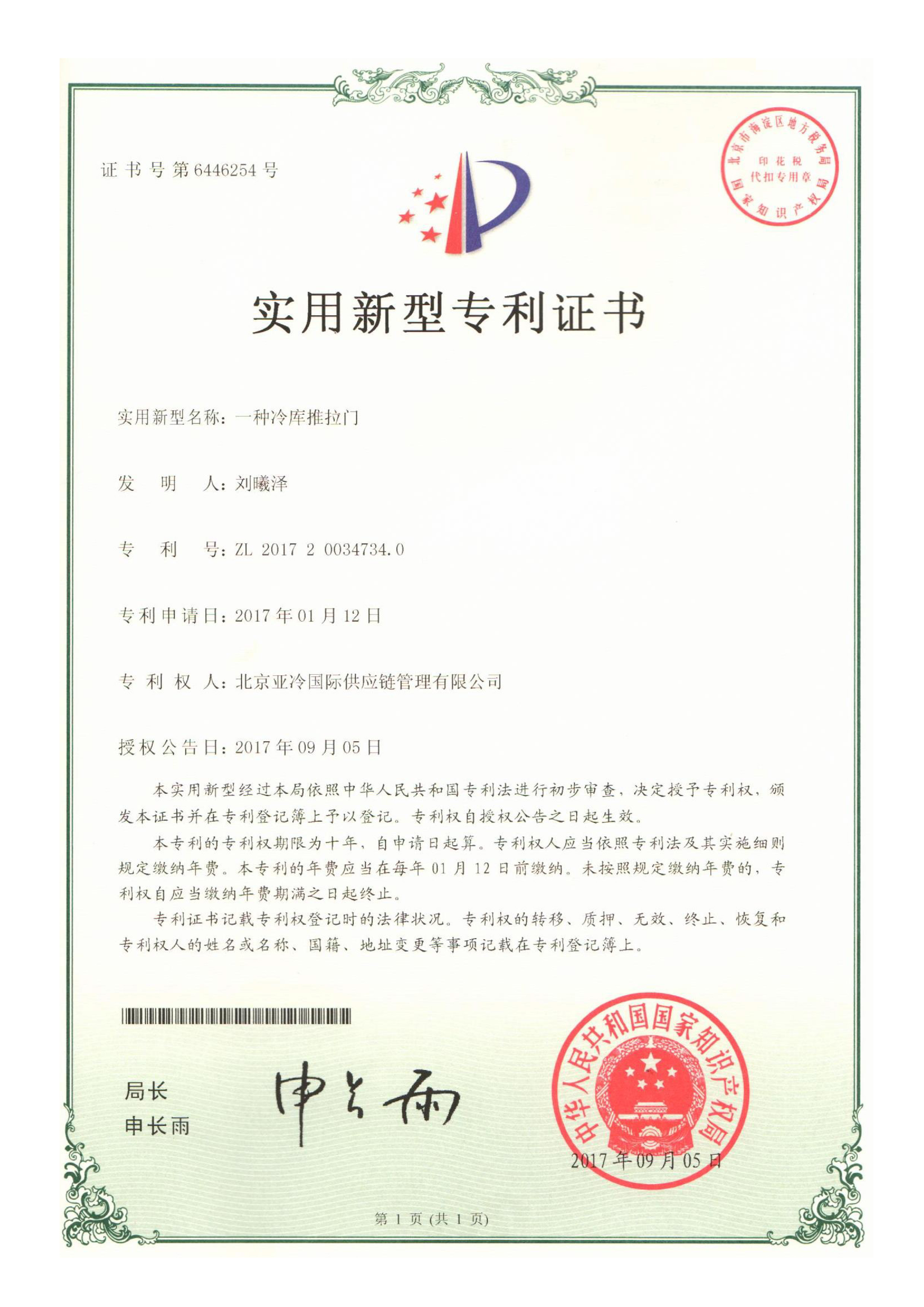 實用新型專利證書 冷庫推拉門